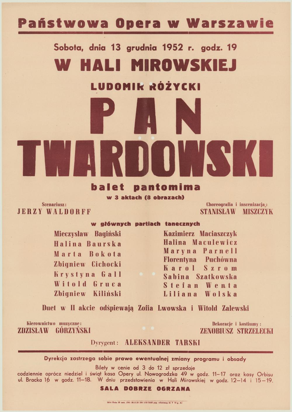 Afisz obsadowy. „Pan Twardowski” Ludomir Różycki 1952-12-13